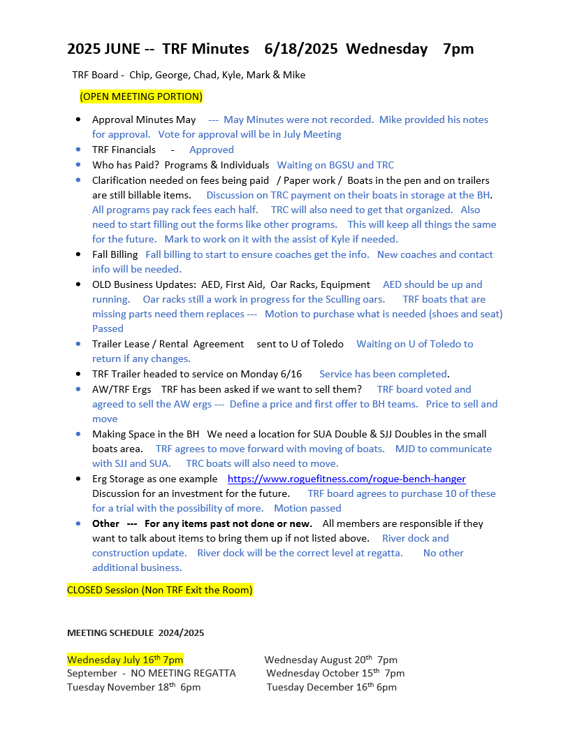 Mike Dibling August 18, 2025 Toledo Rowing Club - AUGUST MEETING SUMMARY Mike Dibling August 18, 2025